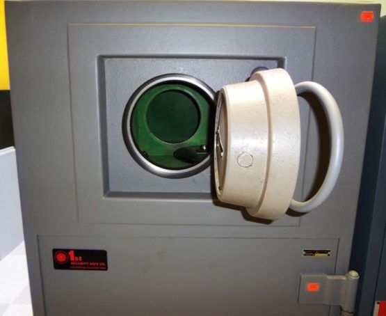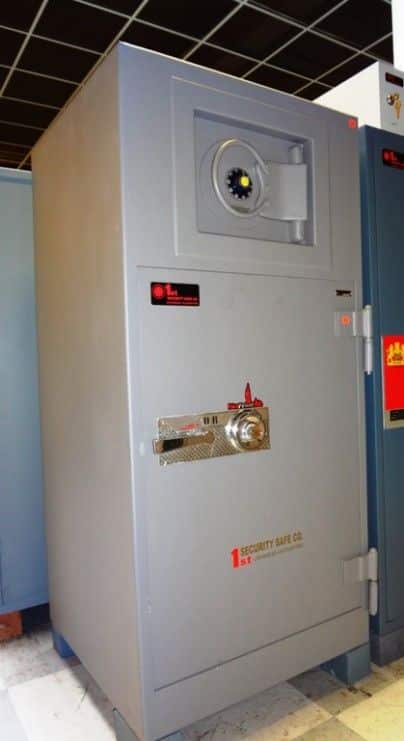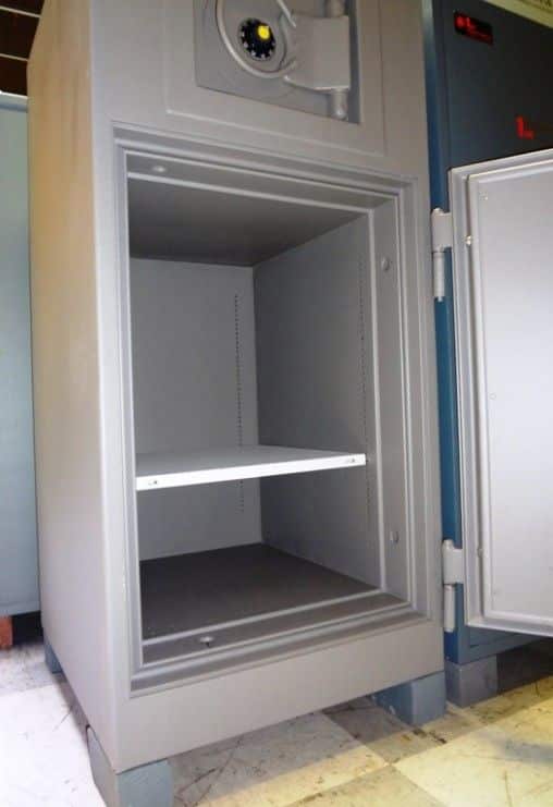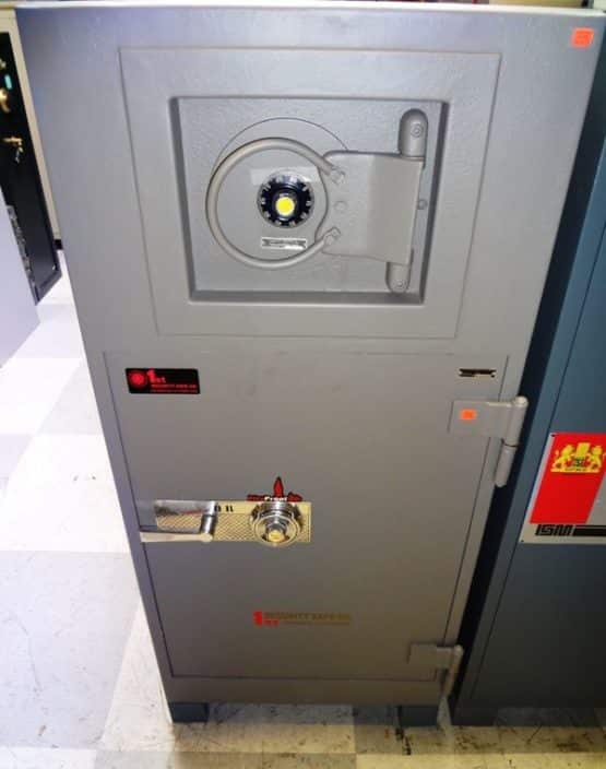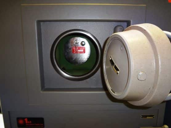 Description: Extremely High Security Round Door TL15 Top Compartment With An Additional Secondary Interior Lockable Compartment, Fire Rated Square Door Bottom Compartment, Both Doors Equipped w/ Combination Dial
